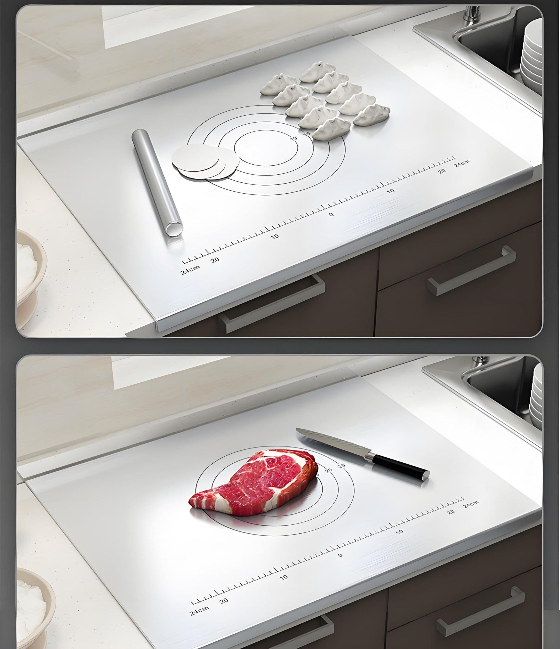 Das Schneidebrett ist doppelseitig nutzbar: Eine Seite eignet sich zum Kneten von Teig, die andere zum Schneiden von Gemüse. So sparen Sie Platz und verbessern Ihre Kocheffizienz. Ob Backliebhaber oder Hobbykoch – dieses Board erfüllt vielseitige Küchenbedürfnisse. Ideal als Vatertagsgeschenk.