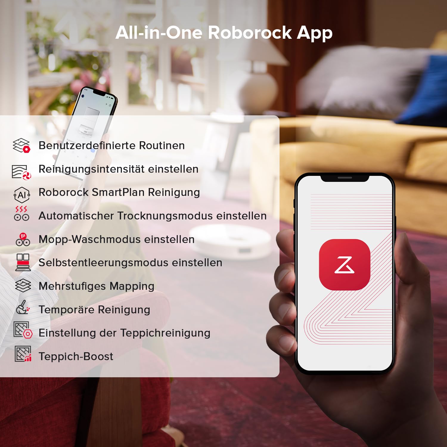 - Intelligente App-Steuerung und anpassbare Reinigung: Mit der Roborock-App haben Sie die volle Kontrolle: Planen Sie die Reinigung, richten Sie bestimmte Räume ein, legen Sie „Nicht-Reinigungszonen“ fest, oder verwenden Sie SmartPlan, um die Saug- und Wischleistung automatisch an die Bedürfnisse der einzelnen Räume anzupassen. Noch nie war die Reinigung so individuell und bequem.